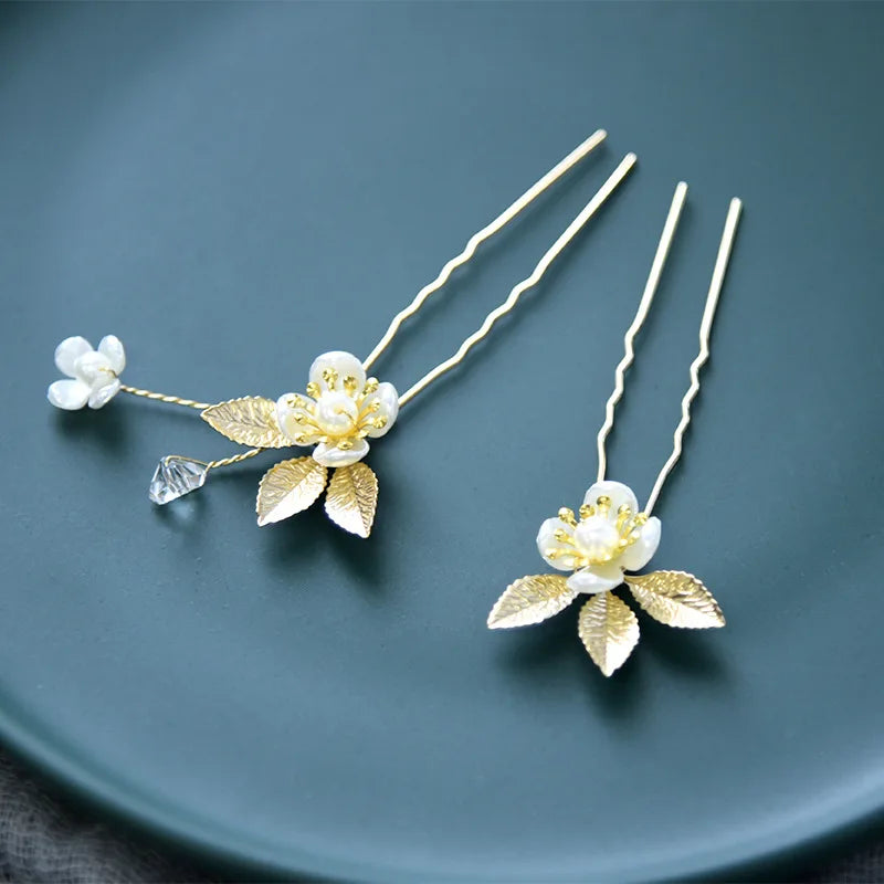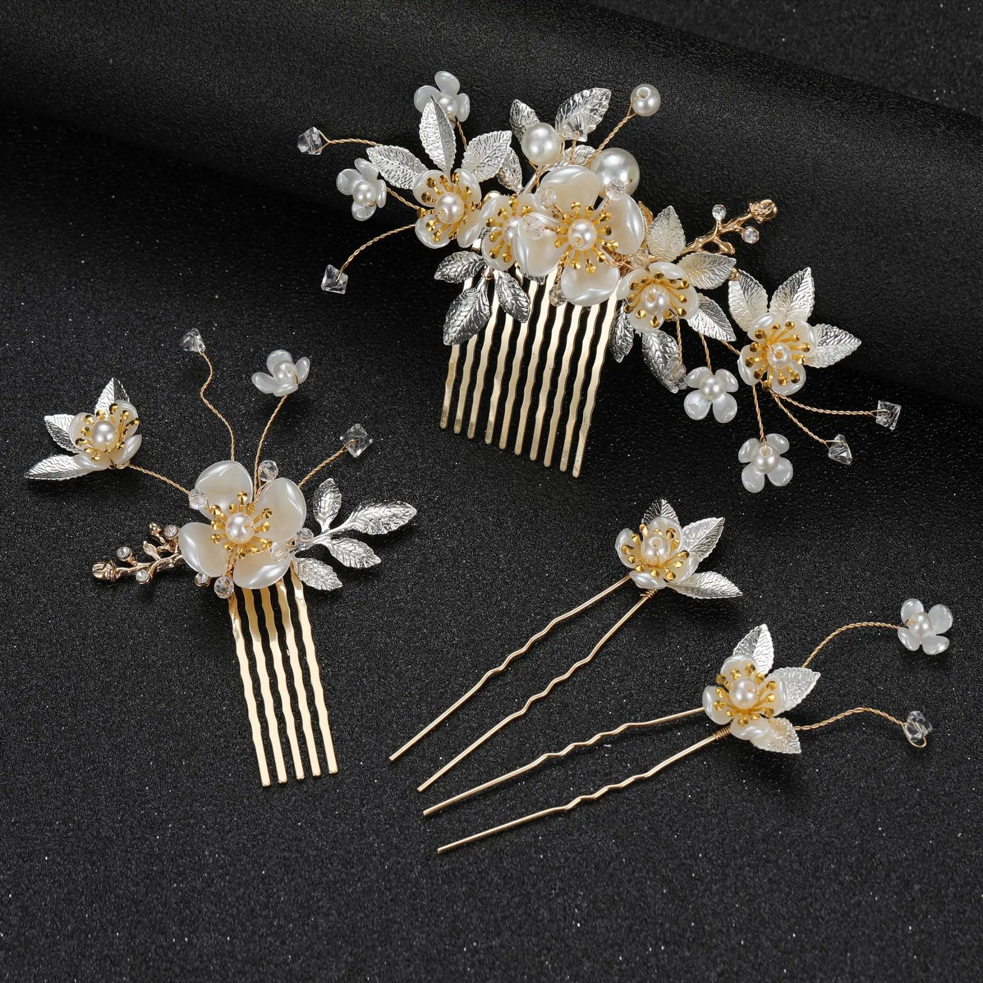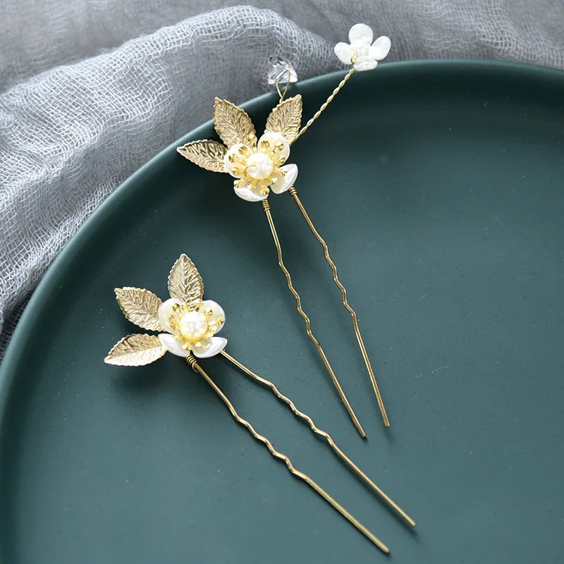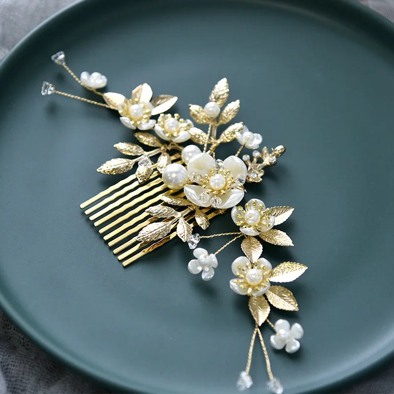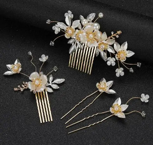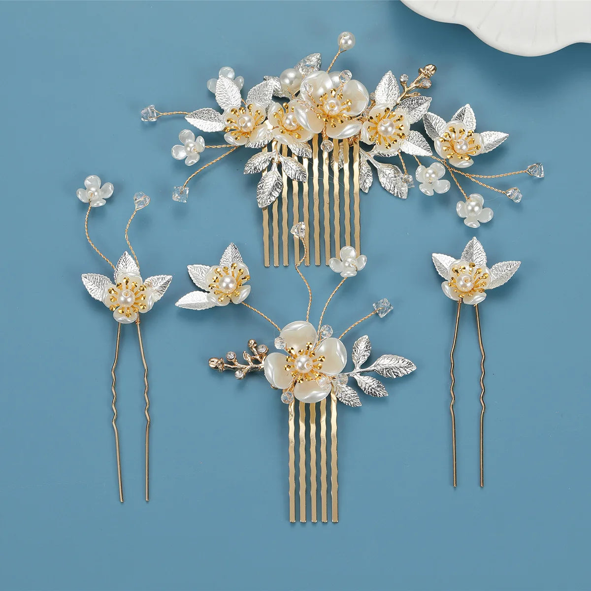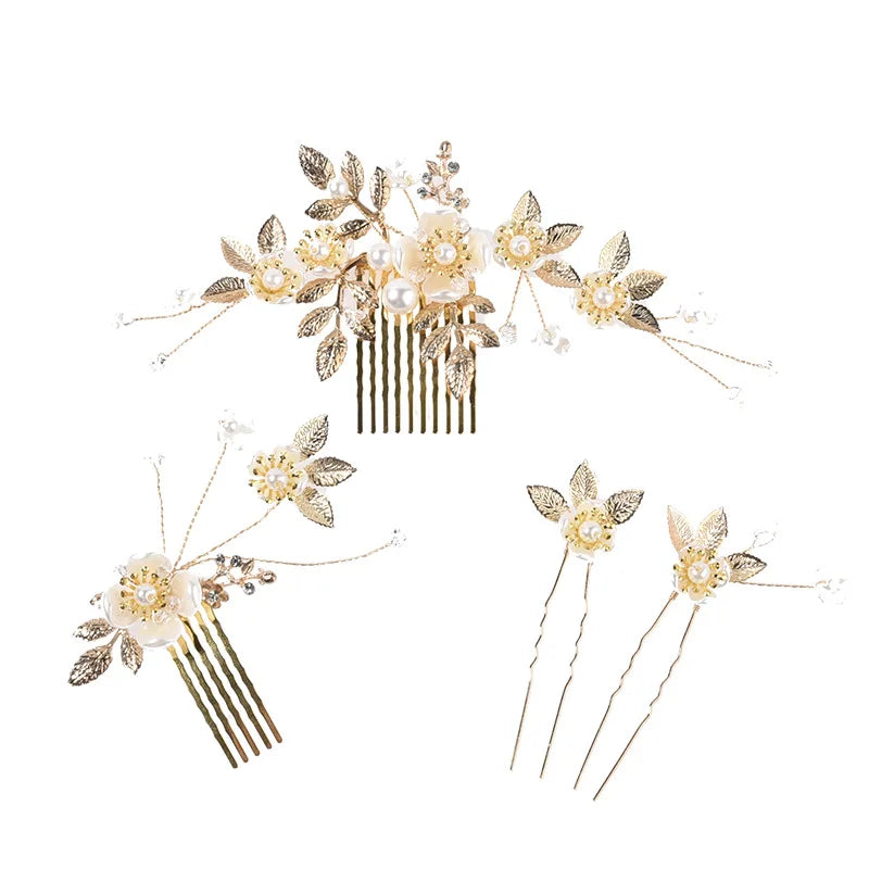 plus Golden Flower Bridal Headdress Rhinestone Leaf Hairpin Pearl Head Flower Plate Hair Decoration Wedding Yarn Dress Accessories