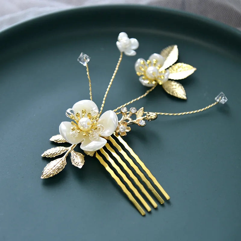 Golden Flower Bridal Headdress Rhinestone Leaf Hairpin Pearl Head Flower Plate Hair Decoration Wedding Yarn Dress Accessories