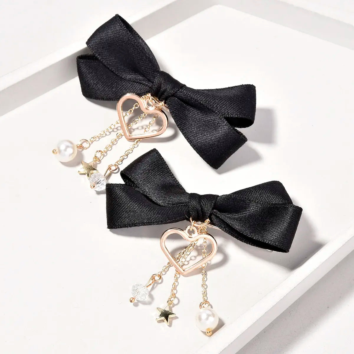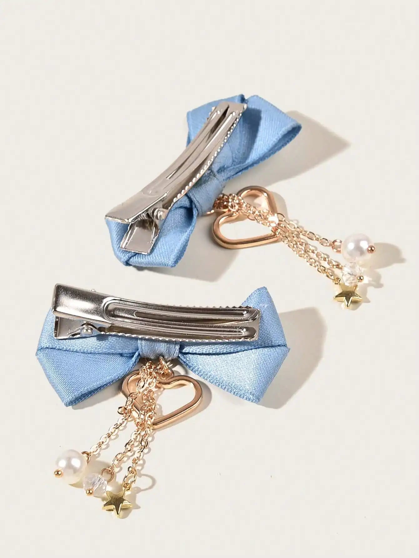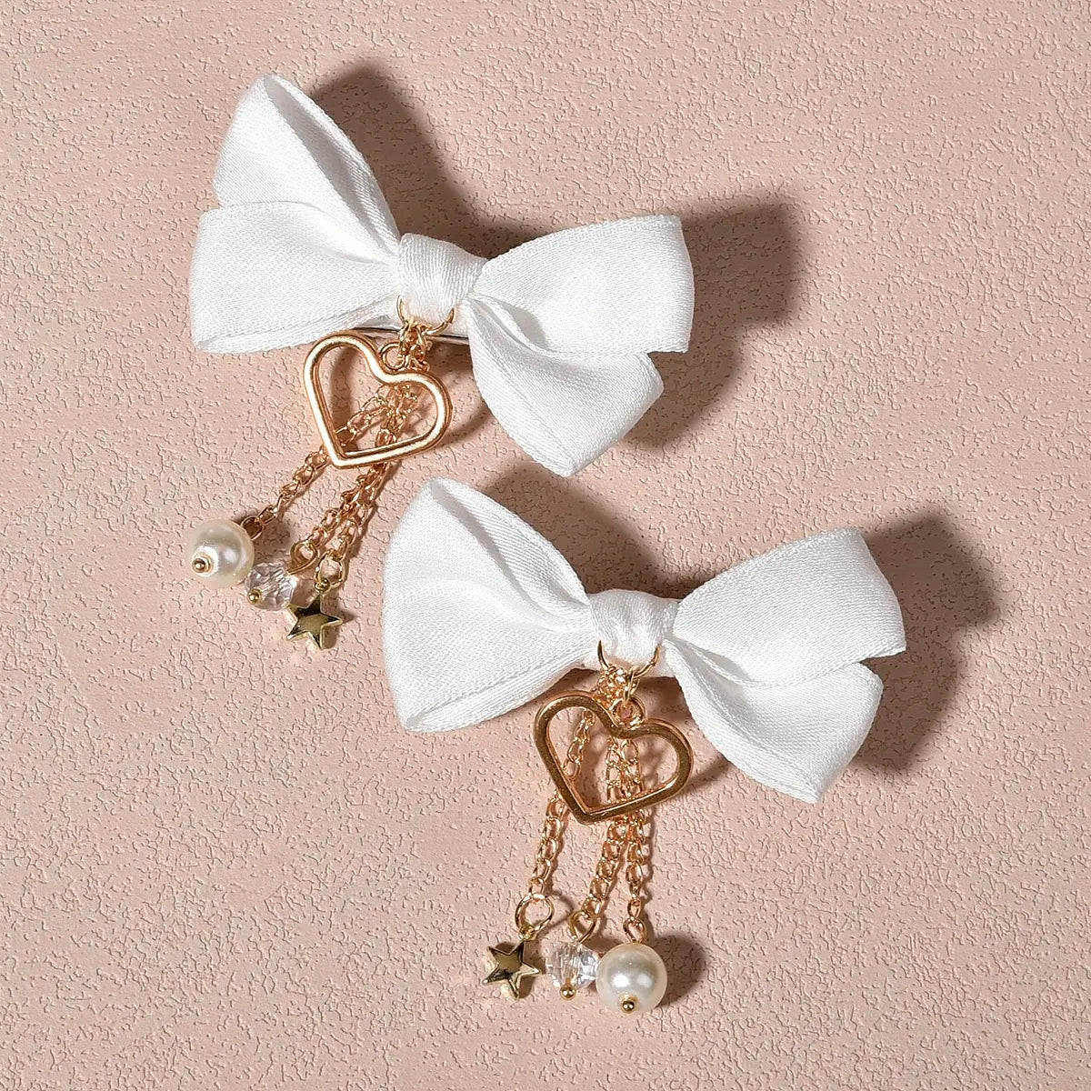 minus Fashion 2 Pcs Bow Tie Hairpin For Girl With Metal Heart and Golden Pearl Baby and Lady Silk Hair Headpiece For Daily Dressing
